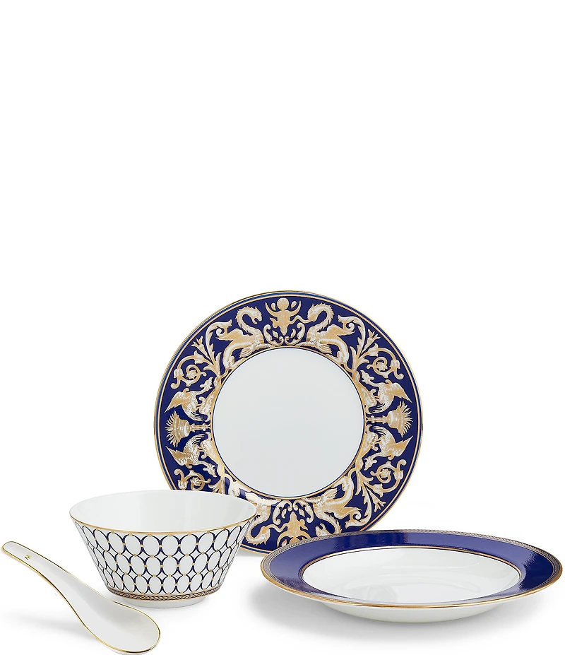 From the Renaissance Collection by Wedgwood, this place setting features: Wedgwood drew upon its considerable archive for this indulgent range. Steeped in authenticity while maintaining a modern, classic style. Combining elegant interior design motifs with the pure oval form of the celebrated Wedgwood cameo, together with bold Florentine accents to give scale and impact. Bone china Part of the Renaissance Gold collection. Complete the set or mix and match with other Wedgwood collections for a unique look Blue is the main color of this item with stunning Gold banding for that extra special touch Featuring a beautiful Classic pattern Perfect to create a Traditional look in your home Lovingly packaged in a beautiful Wedgwood presentation box This 5-Piece dinnerware set, Service for 1: 2 Salad Plate 9"dia. 2 Rim Soup 9"dia 2 Cereal Bowl 5x5 2 Soup Spoon 1.63" x 5.43" Imported.