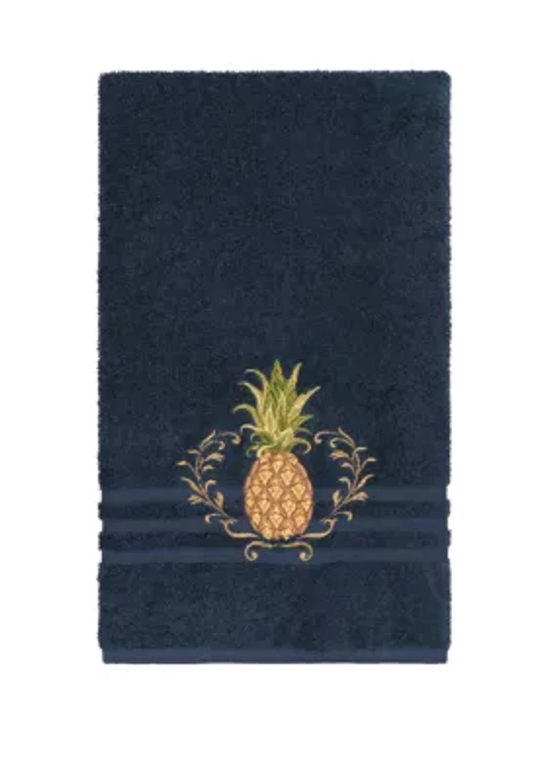 The Welcome Embellished Towel Collection by Linum Home Textiles features a pineapple and scroll motif with metallic accents on a dobby woven border. These soft and luxurious towels are made of genuine premium Turkish Cotton and offer lasting absorbency and superior durability. Available in a range of lovely towel colors Embellished in USA Warranty available Made in Turkey Imported Product Specifications 27 in x 54 in Material & Care Superbly absorbent and quick drying Cotton Machine washable