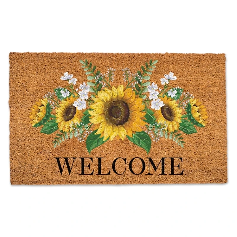 Let this Welcome Sunflower Mix Doormat greet your every time you return home! With cheery blossoms, it will bring a touch of seasonal beauty to your front porch. Doormat measures 30L x 18H in. Crafted of coir with vinyl backing Reads "Welcome" Features a sunflower design Hues of brown, yellow, white, black, and green Water and mildew resistant Designed and printed in the USA Safe for outdoor use Care: Shake well to clean. Avoid exposure to direct sunlight. This item is available at Kirklands.com only, not available in stores. Please note: this item cannot be shipped to APO/FPO addresses.