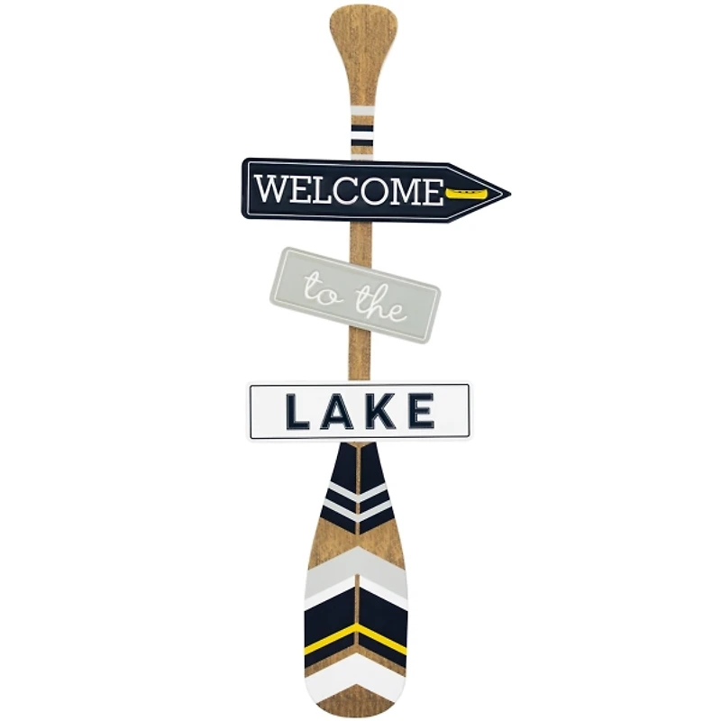 Get ready for summer at the lake with this Welcome to the Lake Paddle Wall Sign. Its fun, rustic design captures the relaxed ambiance of a lake house! Overall dimensions Width: 12 in. Depth: 0.25 in. Height: 31.5 in. Crafted of wood and metal Paddle design Features the phrase "Welcome to the lake" Hues of brown, blue, white, gray, and yellow Weight: 1.3 lbs. Hangs from back-mounted hardware Care: Dust with a soft, dry cloth. This item is available at Kirklands.com only, not available in stores. Please note: this item cannot be shipped to APO/FPO addresses.