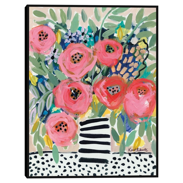 Brighten up your wall space with a bouquet of flowers! Polka dot patterns, vibrant colors, and whimsical brushstrokes create the bold, playful look of this Welcome to the Party Framed Canvas Art Print. Art measures 31L x 1.5W x 41H in. Printed on stretched, polycotton blend canvas Birch frame finish around wrapped canvas Features floral bouquet subject Hues of pink, green, blue, yellow, white, and black Artist: Kait Roberts Weight: 4 lbs. Hanging hardware not included Care: Dust with a soft, dry cloth. This item is available at Kirklands.com only, not available in stores. Please note: this item cannot be shipped to APO/FPO addresses. WARNING: Cancer and Reproductive Harm - For more information go to www.P65Warnings.ca.gov .