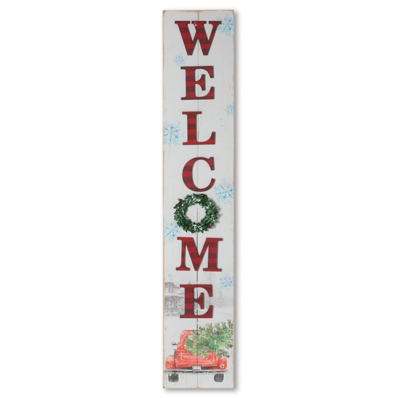 Give the holiday season a warm greeting with this Welcome Wreath Christmas Porch Board. Its beautiful design will give your outdoor decor the perfect cheery touch. Porch measures 8.5L x 0.75W x 46.75H in. Crafted of wood Whitewashed wood plank finish Reads "Welcome" with a wreath as the "O" Features a pickup truck carrying a Christmas tree Snowflake accents Hues of white, red, green, black, gray, and blue Stands on easel back or hangs from jute rope Safe for covered outdoor use Care: Dust with a soft, dry cloth. This item is available at Kirklands.com only, not available in stores. Please note: this item cannot be shipped to APO/FPO addresses.