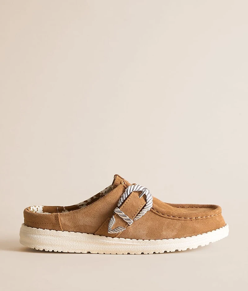Suede slip-on mule Adjustable buckle Elasticized insets Cushioned foam footbed Flex & fold technology
