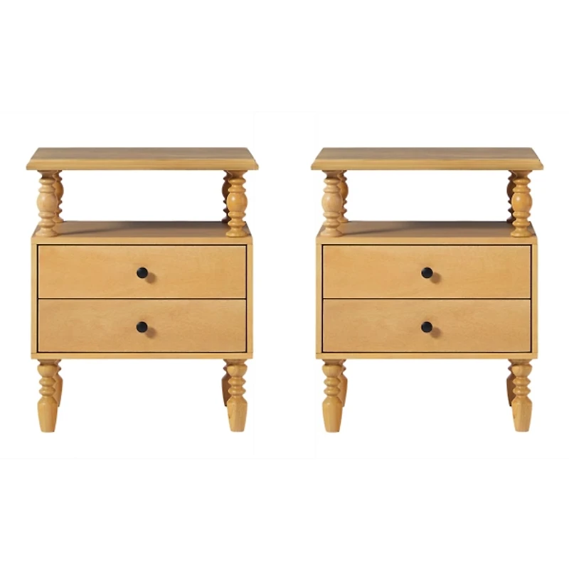 The set of White 2-Drawer Vivienne Nightstands boasts an antique-made-modern look, featuring charming wood-turning details and the heritage-inspired aesthetic. It’s a stand-out set where quality and intricacy shine. Set includes two (2) nightstands Overall dimensions of each nightstand Width: 22 in. Depth: 17 in. Height: 26 in. Crafted of solid wood and solid wood veneer White wood grain finish Includes two (2) drawers and one (1) shelf Spindle style legs Weight: 36 lbs. each Weight capacity: 80 lbs. each Assembly required; easy assembly Not intended for commercial use Care: Dust with a soft, dry cloth. This item is available at Kirklands.com only, not available in stores. Please note: this item cannot be shipped to APO/FPO addresses.