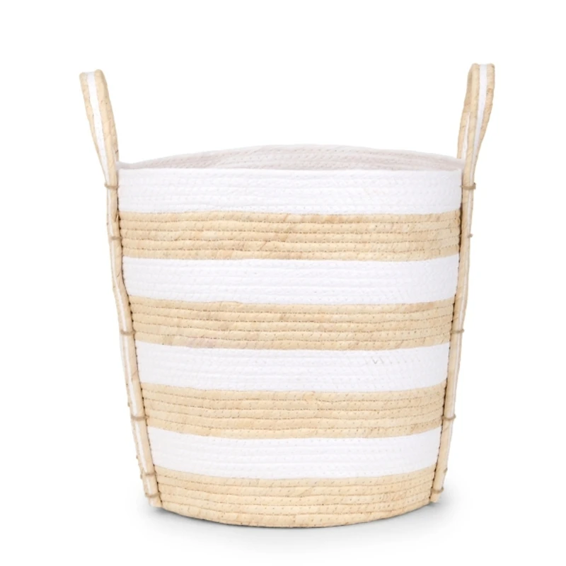 Our Medium White and Natural Straw Braided Basket will add modern-organic charm to your home organization. Perfect for blankets, shoes, toys, and more, this storage basket helps keep clutter at bay. Basket measures 13H x 13.6 in. in diameter Handwoven with straw and paper braided handles Striped, two tone design Braided carrying handles Care: Spot clean. Contact your local Kirkland's store for availability. Quantities and selection may vary by location.