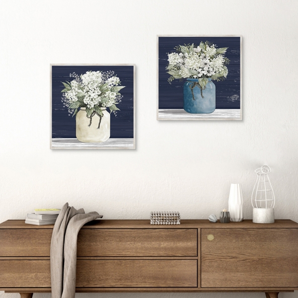 Art inspires, uplifts, and expresses your personal style. Pull your space's look together with this eye-catching White Blossom Bouquet 2-pc. Framed Wall Art Set. Set includes two (2) prints Art measures 21L x 1.5W x 21H in. each Printed on stretched, polycotton blend canvas White wooden flush frame Bouquet subject Hues of blue, white, and green Artist: Cindy Jacobs Hangs from back-mounted hardware; sawtooth hangers included Care: Dust with a soft, dry cloth. Contact your local Kirkland's store for availability. Quantities and selection may vary by location.