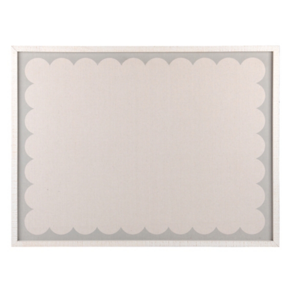 Use this White & Blue Scalloped Edge Pinboard to display treasured photos, postcards, and notes. It offers an easy way to add your personal touch to any wall! Overall dimensions Width: 40 in. Depth: 1.1 in. Height: 30 in. Crafted of wood and fabric White frame finish Board features a scalloped edge design Hues of white and blue Weight: 5.54 lbs. Hangs from back-mounted hardware Care: Dust with a soft, dry cloth. Contact your local Kirkland's store for availability. Quantities and selection may vary by location.