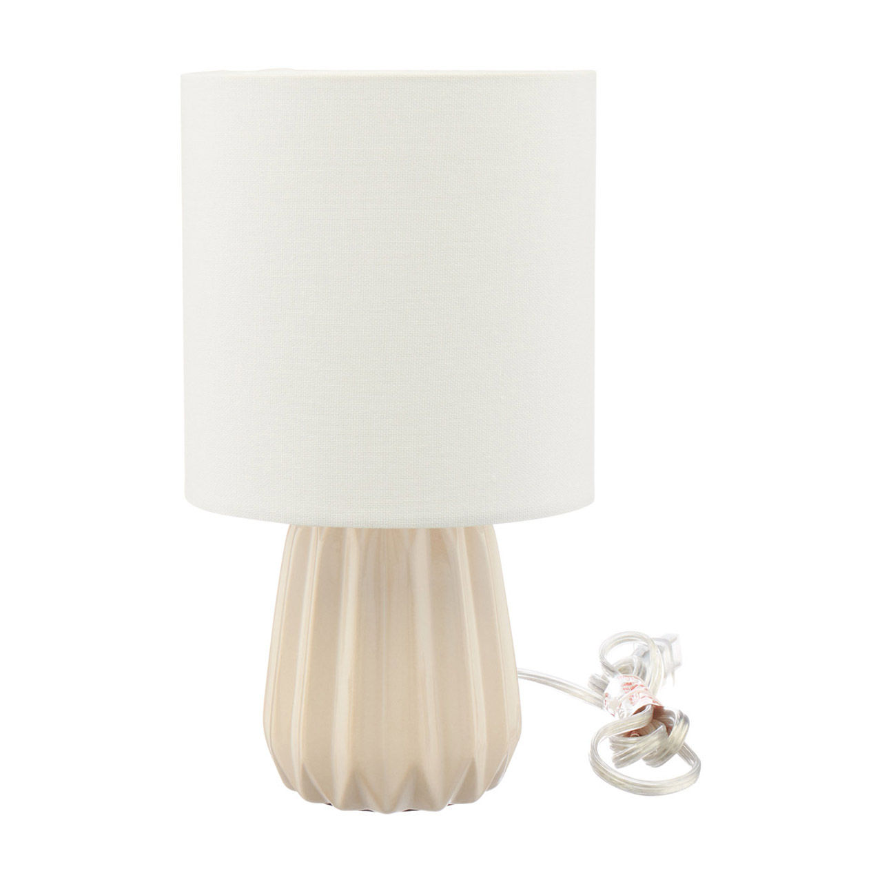 The lamp features a beautifully crafted ceramic base in a soft cream hue, adorned with a subtle, pleated texture that adds depth and visual interest. This unique design element blends seamlessly with the crisp white fabric lampshade, creating a harmonious and sophisticated look that enhances any room's ambiance.