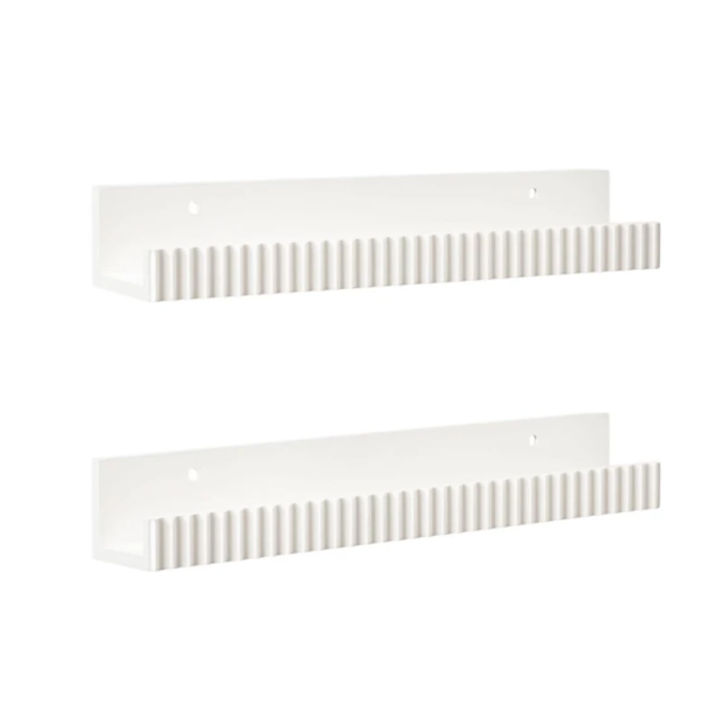 The White Furrow Floating Shelves are a narrow method for displaying your favorite pictures and keepsakes in small spaces. You'll love them in your living room! Set includes two (2) shelves Each shelf measures 3.43L x 24W x 3.54H in. Crafted of wood composite White finish Narrow ledge design Ribbed texture Floating shelves Weight: 4 lbs. Hangs from back-mounted hardware Care: Dust with a soft, dry cloth. This item is available at Kirklands.com only, not available in stores. Please note: this item cannot be shipped to APO/FPO addresses.