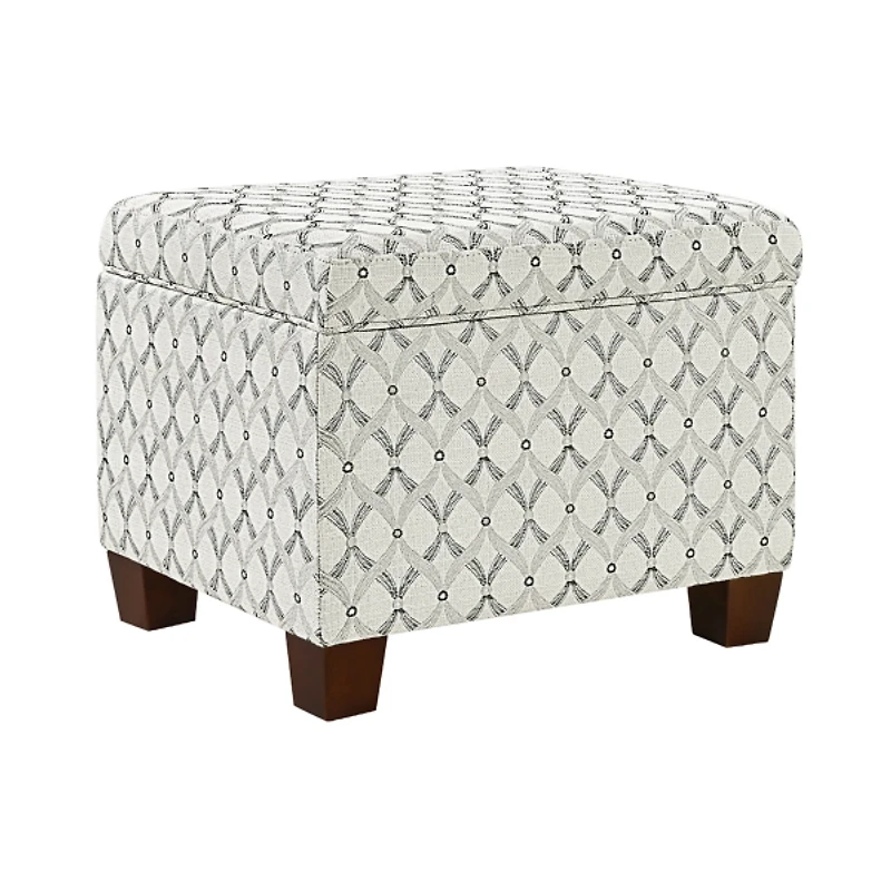 Bring an elegant and functional touch to your living room or bedroom with this White & Gray Madison Storage Ottoman! With a sophisticated upholstery design and interior storage space, you’ll love how easy it is to incorporate this ottoman into your space! Ottoman measures 21.5L x 17.75W x 18.5H in. Crafted with a wood frame Upholstered in fabric with high-density foam Espresso wood finish Gray and white ribbon upholstery pattern Tapered wood block feet Features interior storage space Pressure hinge to allow lid to stay open on its own Easy assembly: Attach feet. Not intended for commercial use Care: Spot clean. This item is available at Kirklands.com only, not available in stores. Please note: this item cannot be shipped to APO/FPO addresses.