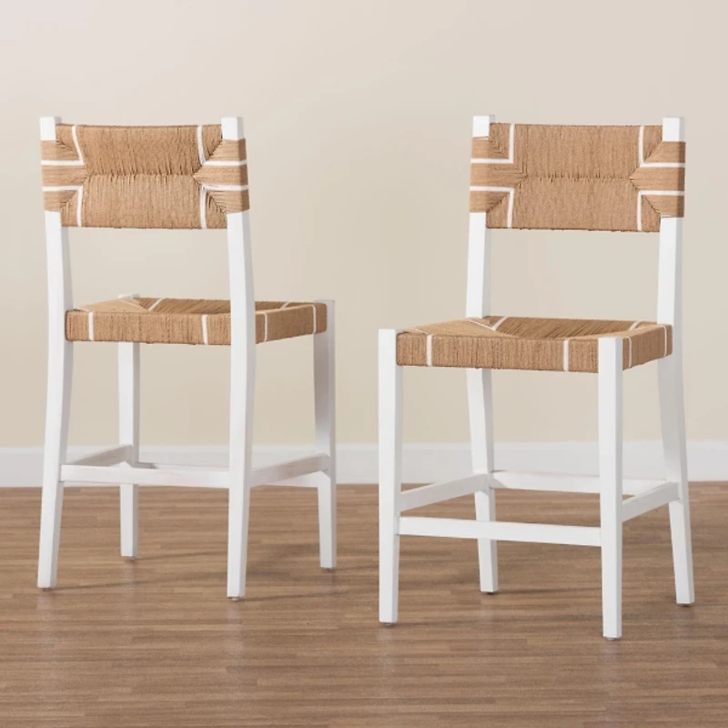 Reimagine your kitchen or dining space with these White Wood Woven Talli Counter Stools. The clean, bright white wood finish complements the natural woven seats and backrests, perfect for coastal or bohemian homes! Set includes two (2) counter stools Each stool measures 21.8W x 20.7D x 43H in.; seat height: 25 in. Crafted of mahogany wood White finish Features geometric woven rope seat and back Ergonomic seating Convenient footrests Tapered legs No assembly required Not intended for commercial use Care: Wipe with a soft, dry cloth. This item is available at Kirklands.com only, not available in stores. Please note: this item cannot be shipped to APO/FPO addresses.