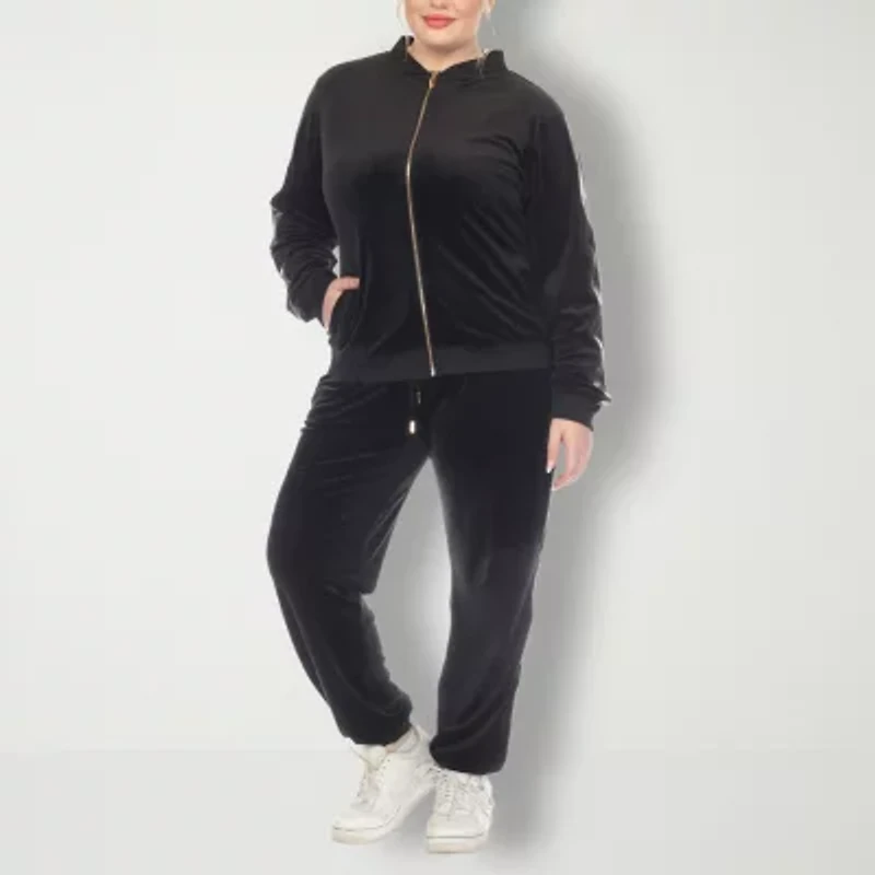 This White Mark women's plus tracksuit set is the ultimate pairing for stylish lounging or casual days. Made from soft velour, the set includes a long-sleeve zip jacket with side pockets and a pair of matching pull-on cuffed-leg pants. Wear them with sneakers or slides.