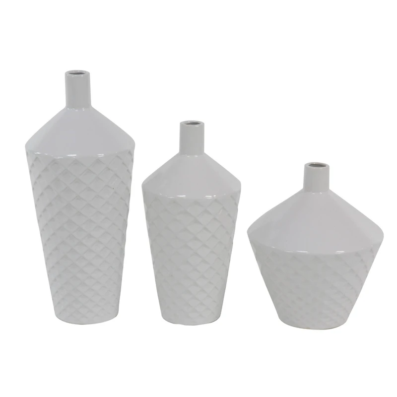 Displayed in your dining or living room, entryways or hallways, this White Porcelain Modern Vase Set is sure to bring charm and joy to any space. Use as a flower holder on your coffee, console, and kitchen tables, or as a decorative piece on a book shelf or office shelf. This set of modern vases can be displayed as solo decorations all around the house. Designed with black rubber stoppers at the base that prevent scratching furniture and table tops, as well as sliding around. Details: White Large: 15" x 7" Medium: 13" x 7" Small: 10" x 9" Openings are 1" wide Porcelain Recommended for indoor use 3 vases