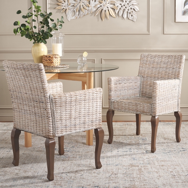 The set of White Rattan Curved Legs Dining Chairs will perfectly blend with any farmhouse or French country aesthetic. The cabriole legs and woven seats result in a casual yet chic look! Set includes two (2) chairs Each chair measures 23L x 24.4W x 34H in.; seat measures 17.7H in. Crafted of rattan and wood Brown leg finish Whitewashed wicker chair finish Features a straight back and high arms French cabriole leg shape Weight capacity: 275 lbs. each Assembly required Not intended for commercial use Care: Dust with a soft, dry cloth. This item is available at Kirklands.com only, not available in stores. Please note: this item cannot be shipped to APO/FPO addresses. WARNING: This product can expose you to chemicals including wood dust which is known to the state of California to cause cancer and birth defects or other reproductive harm. For more information go to www.P65Warnings.ca.gov .