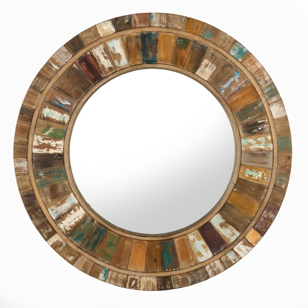 Round Multicolor Distressed Wood Wall Mirror