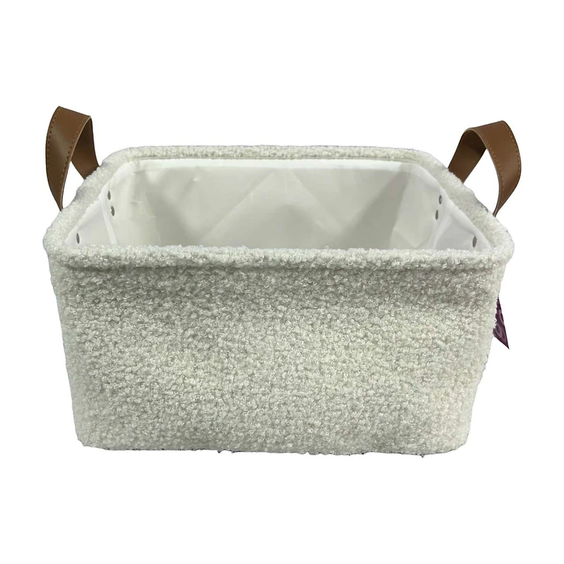 Organize your home with a touch of cozy elegance using our White Sherpa Storage Basket, Small. This charming basket is perfect for tidying up small items while adding a stylish accent to any room. Measuring compactly, it's ideal for storing everything from accessories to office supplies, toys, and more.