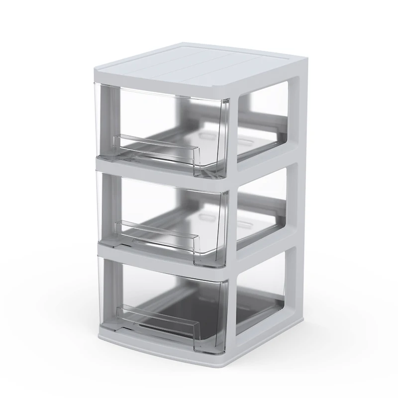 This three-drawer cart system features a white casing with clear drawers so you can easily view the contents before opening and retrieving your items or supplies. The drawers have a built-in lip so you can pull the drawers out smoothly with a handhold. This storage unit is great for craft rooms, classrooms, closets, kid's rooms and more.Details:White with clear drawers13.3" x 14.5" x 25.2" (24cm x 37cm x 64cm) overall size3 drawers (13.2" x 13.7" x 7" (33.5cm x 34.7cm x 17.7cm)PET and polypropyleneIdeal for craft rooms, classrooms and more