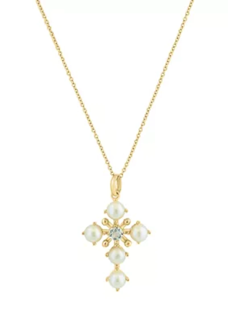 Keep your faith close and style on-point with this embellished cross pendant necklace from Effy®. 1 White Topaz, 5 Freshwater Pearls Lobster closure Polished finish Prong setting Lifetime limited liability warranty available Imported Product Specifications 18" L 1/4 ct. t.w. White Topaz Material & Care 14K Yellow Gold Clean with a soft cloth