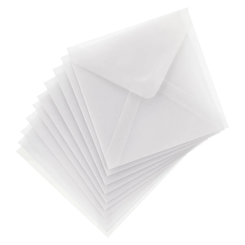 Enclose your formal correspondence and handmade cards in these classic vellum envelopes from Recollections. Featuring a fine translucent material and glue seal, these envelopes are ideal for shower and wedding invitations or any stationary that calls for a lovely touch of simplicity. They can also be easily embellished to fit your theme using paints, markers, stickers and more!Details:Translucent whiteAvailable in multiple sizes and counts113 gsmGlue sealVellum and gum
