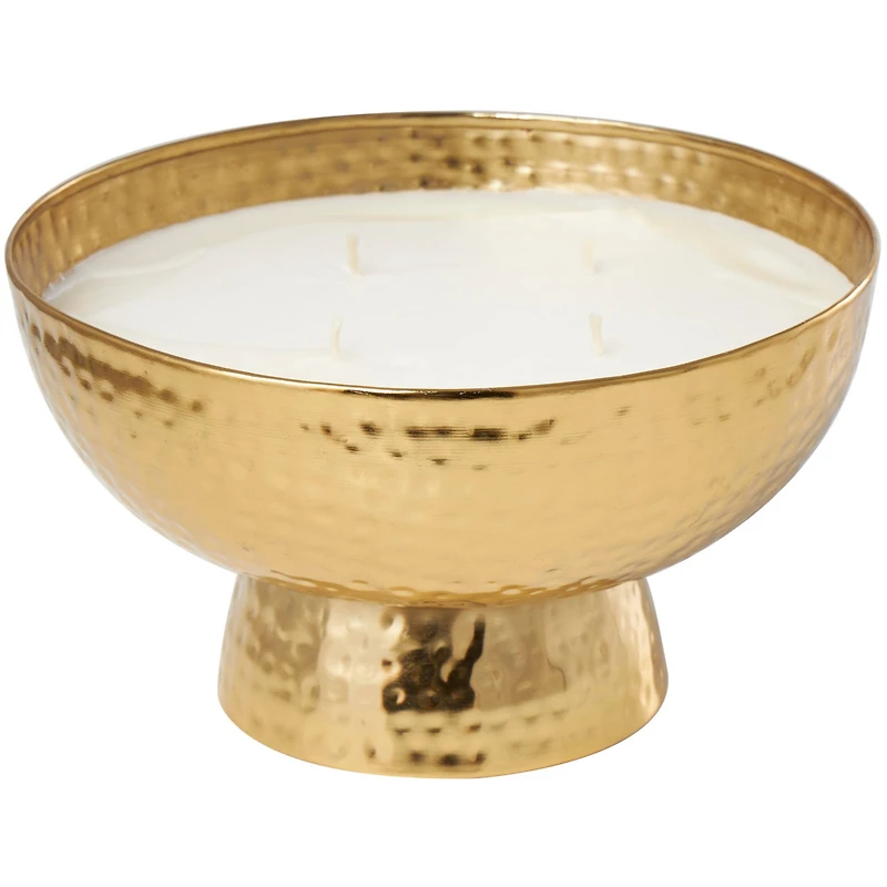 Inspired by sleek elegance and clean lines, a minimalistic design offers effortless luxury with monochromatic tones and bold, angular structures. Our sleek decorative candle is crafted from white wax housed in a gold metal bowl, which can be used as a decorative accent piece once the candle burns through. Minimalistic polished gold candle bowl houses a white wax 4-wick candle, for a classic and timeless design. The 4-wick design of this accent candle provides a strong and even burn, allowing for a longer lasting, more aromatic and relaxing experience. Style this scented candle by placing it on coffee table, console, or bookshelf with stacked books and fresh greenery to create a warm and inviting ambiance in your living space. It is designed with felt or rubber stoppers at the base that prevent scratching furniture and table tops, as well as sliding around. It features one English Garden scented white wax candle with 4 wicks and a 130-hour burning time. English Garden scented candle composed of bright berry blend with notes of peach and Spring florals. This item ships in one carton. This item ships fully assembled in one piece. Details: English garden candle with wide hammered gold container 9.95" x 10.1" x 5.8" 5.62 lb. 70 oz. candle 4 wicks and 130-hour burning time Bright berry blend with notes of peach and Spring florals scented Modern style Wax, metal materials For indoor use Made in India WARNING: Burn within sight Keep away from things that can catch fire Keep away from children and pets