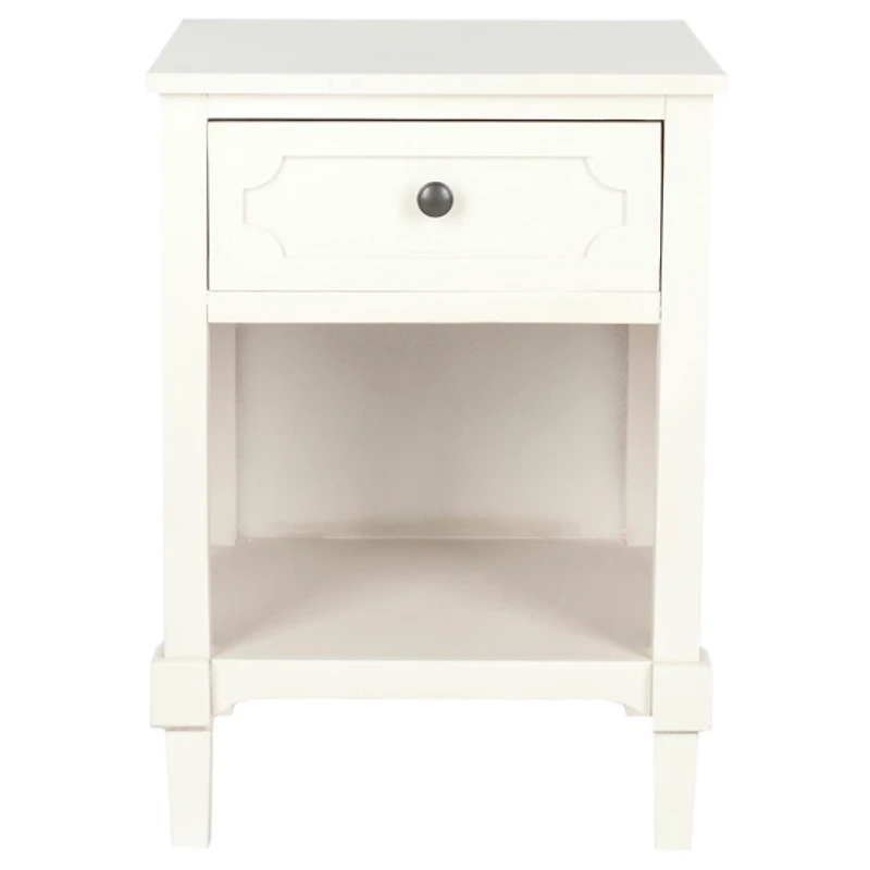 A chic new take on French farmhouse decor, the White Wood Open Shelf Rosa End Table takes a familiar vintage form and transforms it into a boutique style icon. This table is perfect for additional storage in an entryway or in pairs framing a sofa. End table measures 16.9W x 15D x 24H in. Crafted of pine wood, MDF, and wood veneer White finish Features one (1) drawer and one (1) open shelf Carved drawer front Drawer measures 13.5W x 13D x 5H in. Shelf measures 18W x 16.5D x 10.4H in. Weight: 18 lbs. Weight capacity: 35 lbs. Assembly required Not intended for commercial use Care: Wipe with a soft, dry cloth. This item is available at Kirklands.com only, not available in stores. Please note: this item cannot be shipped to APO/FPO addresses.