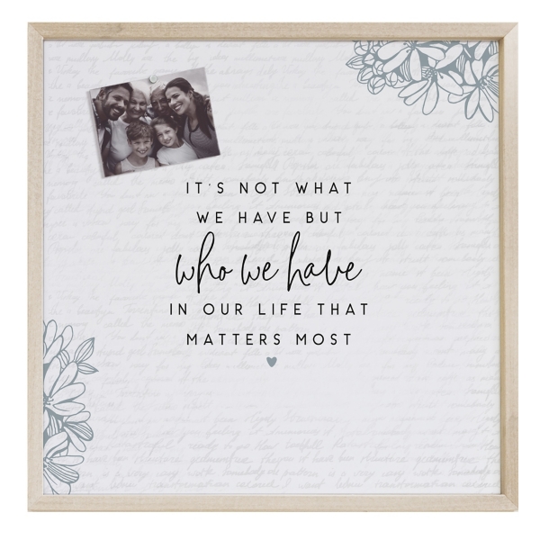 Our Who We Have Framed Pinboard is perfect for pictures of friends and family! You'll love the sweet reminder to cherish your loved ones. Keep your favorite memories close by with this pinboard! Plaque measures 24L x 1.5W x 24H in. Crafted of wood, cloth, and steel Gray cloth finish Brown frame finish Reads "It's not what we have but who we have in our life that matters most" with floral details Hues of black, slate blue, and gray Hand-crafted in the United States Weight: 0.75 lbs. Care: Dust with a soft, dry cloth. This item is available at Kirklands.com only, not available in stores. Please note: this item cannot be shipped to APO/FPO addresses.