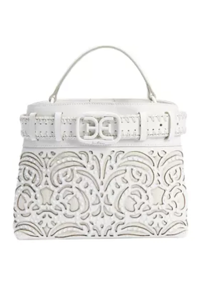 Detailed with a floral cut-out design, this chic satchel from Sam Edelman belongs in your collection. Magnetic closure Removable strap with 19" - 23" drop Exterior: signature Sam Edelman hardware, intricate leather detailing with beading, belting around top of bag Interior: back wall zip pocket Imported Product Specifications 8" H x 11" W x 4" D Material & Care Leather trim Leather Spot clean only