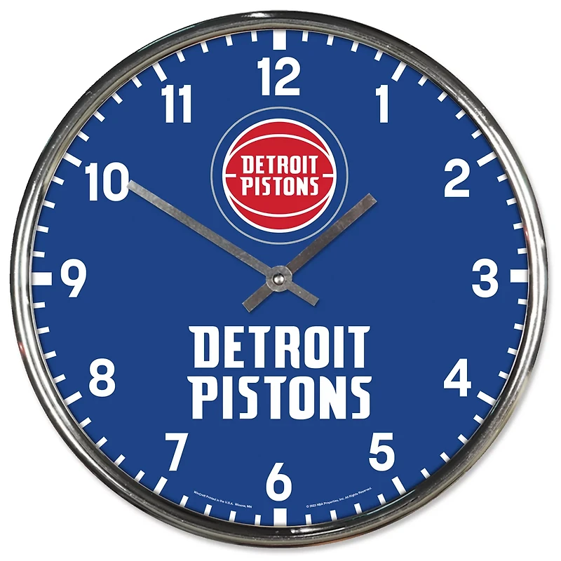 Hang up this Chrome wall clock from WinCraft in your home or fan cave so you're reminded of the Detroit Pistons every time you check the time Eye-catching team graphics and a quality design make this clock a must-have for avid Detroit Pistons fans