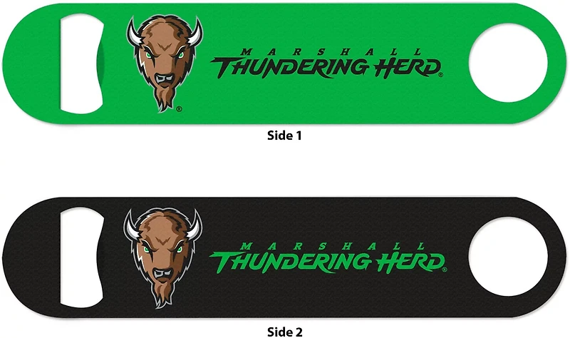 Enjoy game day beverages with the WinCraft Marshall University Bottle Opener. This heavy-duty metal tool features a bottle opener on one end and a can opener on the other, letting you open all kinds of drink containers with ease. A Thundering Herd graphic shows your team love.