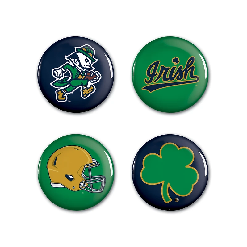 Show off your Notre Dame Fighting Irish pride with this WinCraft 4-Pack Button Set. Each button in this set measures approximately 1.25" and features a safety pin back for easy attachment. Show your unwavering support for the Fighting Irish by sporting these buttons on your backpack, jacket, or anywhere you want to display your team pride.