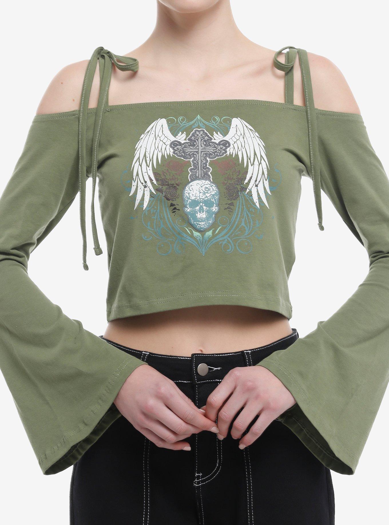 Add some Y2K flare to your look with this crop top! It features a cold shoulder design with tie straps and dramatic bell sleeves. Comes with a central print of a skull, cross and angel wings.
