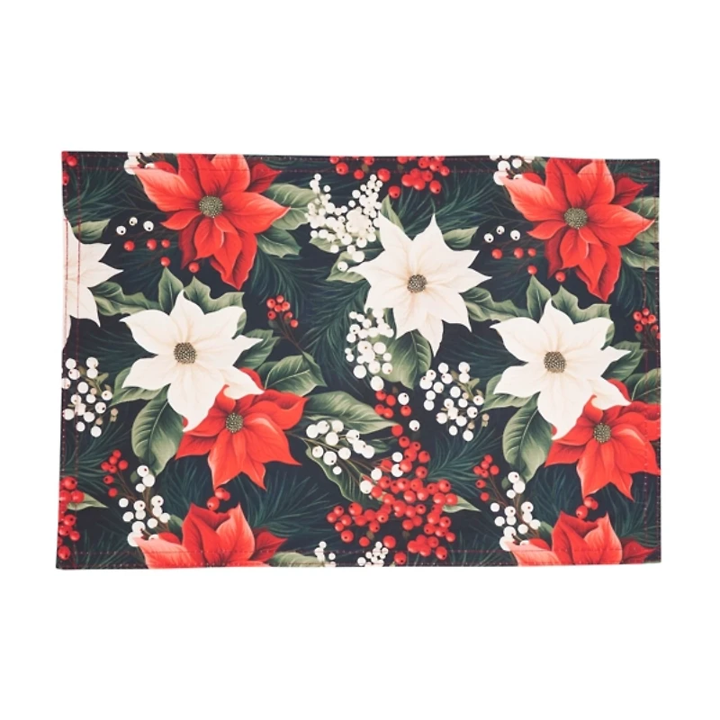 Add a bold kind of elegance to your holiday tablescape with the set of Winter Bloom Christmas Placemats. Decorated with poinsettias and berries, these placemats awaken any table setting. Set includes four (4) placemats Placemats measure 19L x 13W in. each Crafted of polyester Features poinsettias and berries design Rectangular shape Hues of black, red, ivory, and green Non-reversible design; unlined Color of product may exhibit slight variations due to the nature of the dyeing process, difference in lighting conditions, and individual monitor settings. Care: Warm machine wash. Do not bleach. Hang dry. Do not iron. This item is available at Kirklands.com only, not available in stores. Please note: this item cannot be shipped to APO/FPO addresses.