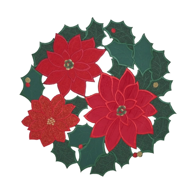 Host your Christmas gatherings with the set of Winter Bloom Poinsettia Placemats. Their shaped designs and cutout accents add a unique layer to your holiday table setting. Set includes four (4) placemats Placemats measure 15 in. in diameter each Crafted of polyester Features poinsettia and leaves design Cutout accents Hues of red and green Non-reversible design; unlined Color of product may exhibit slight variations due to the nature of the dyeing process, difference in lighting conditions, and individual monitor settings. Care: Spot clean. This item is available at Kirklands.com only, not available in stores. Please note: this item cannot be shipped to APO/FPO addresses.