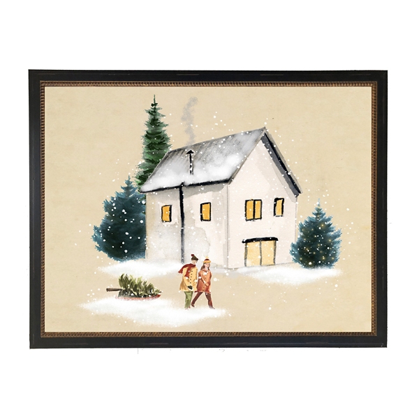 Capture the heartwarming charm of the holiday season with the Winter Home Scene I Framed Art Print. This serene winter scene features a cozy, snow-covered cottage nestled among evergreen trees and two figures carrying a freshly cut Christmas tree. Overall dimensions Width: 17 in. Depth: 1 in. Height: 13 in. Frame crafted of wood Black frame finish Gold beaded detailing Features a home winter scene Encased in glass Hues of beige, white, and green Weight: 2 lbs. Hangs from back-mounted hardware Care: Dust with a soft, dry cloth. This item is available at Kirklands.com only, not available in stores. Please note: this item cannot be shipped to APO/FPO addresses.