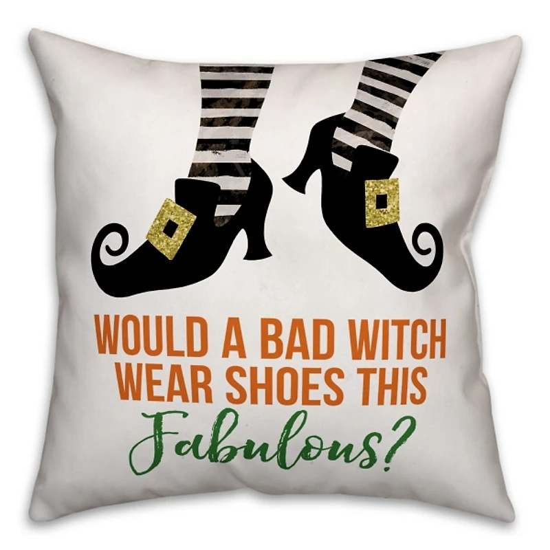 Calling all shoe lovers this holiday season! Don your striped stockings and channel your inner witch with our Witch Shoes Reversible Halloween Pillow. Place in a spot as fabulous as its message! Pillow measures 18L x 18H in. Crafted of polyester with polyester fill Hues of black, orange, green, and yellow Features phrase "Would a bad witch wear shoes this fabulous?" Witch's legs and buckle shoes details Design prints on back side Care: Spot clean only. This item is available at Kirklands.com only, not available in stores. Please note: this item cannot be shipped to APO/FPO addresses.