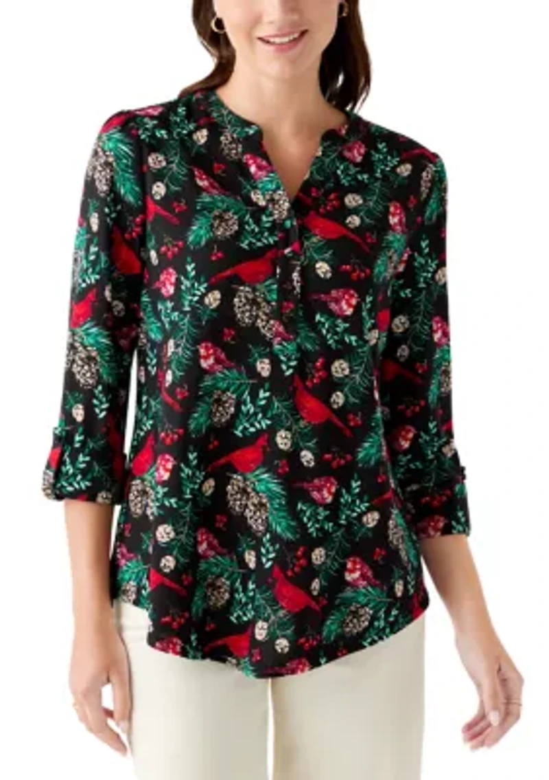Featuring 3/4 sleeves and a Henley neck, this stylish shirt from Kim Rogers® provides a festive and fashionable look for the holidays. Button closure Henley neck 3/4 sleeves Imported Belk Exclusive Product Specifications 29" L Material & Care Polyester, spandex Machine washable