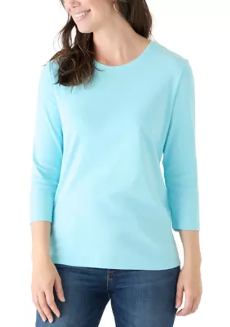 This shirt by Kim Rogers® is made from 100% cotton and features a relaxed crew-neck and 3/4 sleeves that are easy to wear, making it perfect for all-day comfort and a versatile everyday piece. Pullover Crew neck 3/4 sleeves Imported Product Specifications 27" L Material & Care 100% cotton Machine washable
