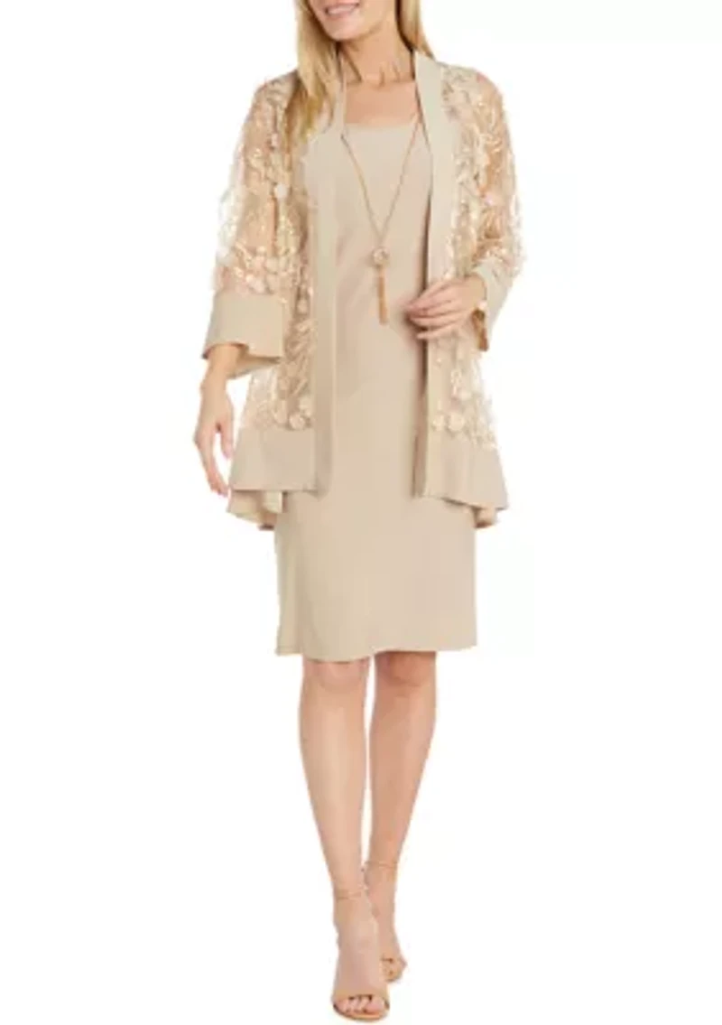 This elegant two-piece jacket dress exudes sophistication and style. Crafted from a luxurious blend of polyester and spandex, it ensures a comfortable and flattering fit. The dress features a scoop neckline, three-quarter sleeves, and a knee-length silhouette that flatters any figure. Perfect for cocktail parties and special occasions, this dress will make you feel confident and radiant. 2-piece set Jacket: open front, 3/4 set-in sleeves Dress: pullover, round neck, sleeveless Lined Imported Product Specifications Jacket: 35" L Dress: 41" L Material & Care Polyester Hand wash