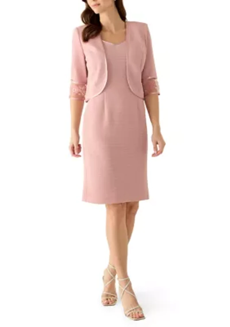 This elegant two-piece dress is perfect for any special occasion, especially as a stunning mother-of-the-bride outfit. The midi dress is crafted from a comfortable and stretchy polyester/spandex blend, ensuring a flattering fit. The crew neckline and elbow-length set-in sleeves provide a sophisticated touch, while the 3D embroidered trim and satin piping add a touch of glamour. The dress falls at a graceful 42 inches, creating a beautiful silhouette. With its zip closure for easy wear, this dress is sure to make you feel confident and radiant on your special day. Zip closure Crew neck Elbow sleeves Unlined Imported Product Specifications 42" L Material & Care Polyester, spandex Hand wash
