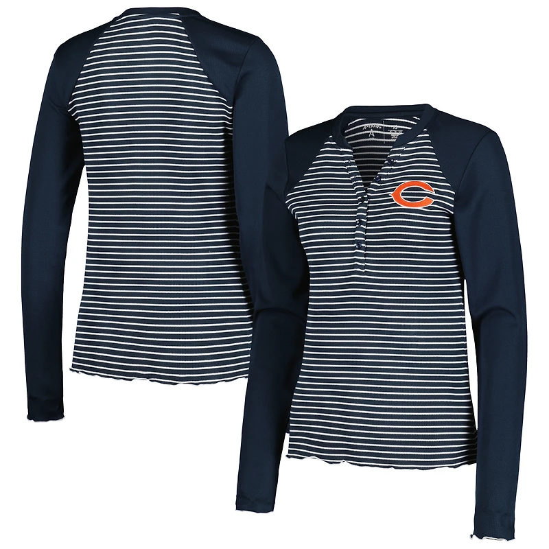 The Women's Antigua Navy Chicago Bears Maverick Waffle Henley Long Sleeve T-Shirt is the perfect way to show unwavering support for the Chicago Bears. This stylish and comfortable shirt features heat-sealed fabric applique with embroidered details, a five-button placket, and raglan sleeves. Contrast overlock stitch at the sleeve and bottom hem adds flair, while the polyester and spandex material ensures a comfortable fit. Whether cheering at Soldier Field or relaxing at home, this shirt is sure to become a favorite.
