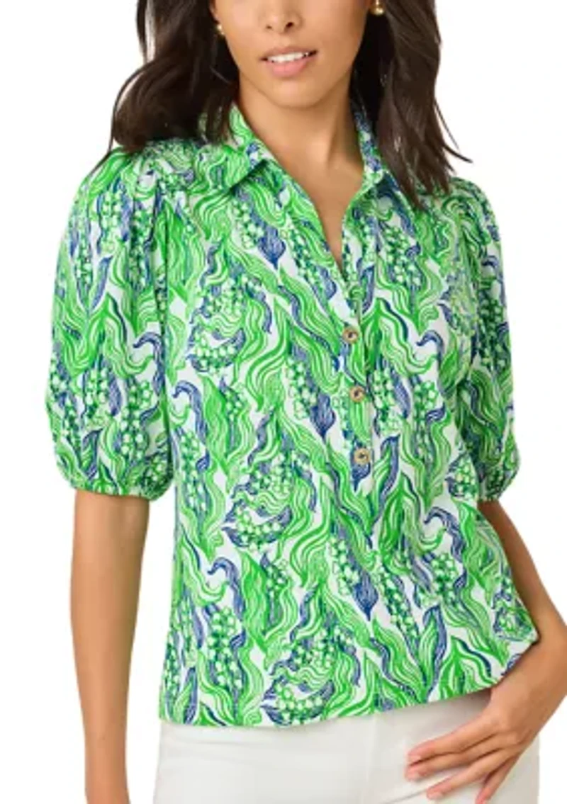 This Lilly Pulitzer® knit top is perfect for any occasion, featuring charming puff sleeves and a stylish straight fit design for a chic look all day long. Button closure Collar Short puff sleeves Imported Product Specifications 24" L Material & Care 100% supima cotton Machine washable