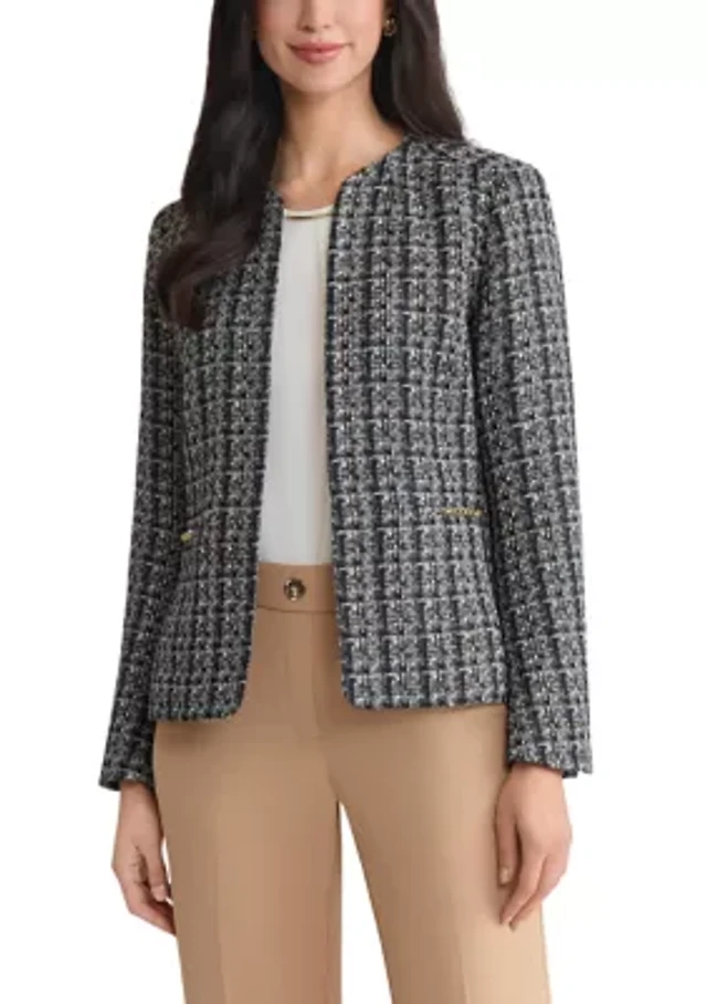 Kasper Long Sleeve Plaid Crepe Cardigan Jacket