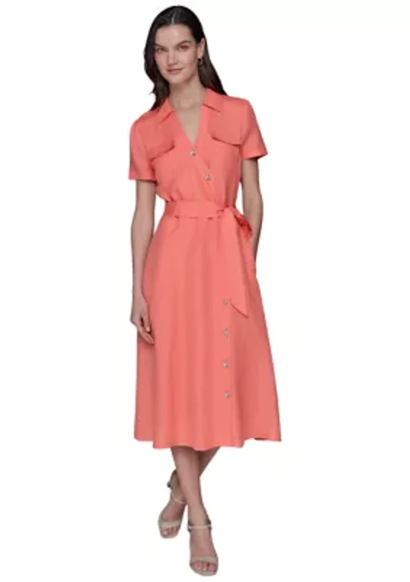 Stunning and stylish, this button-front dress from KARL LAGERFELD PARIS features a belted waist for a chic look. An asymmetrical button detail and puff-sleeves enhance its feminine allure. Button closure Collar Short puff sleeves 2 chest flap pockets, 2 side-seam pockets Lined Imported Product Specifications 44" L Material & Care Linen Hand wash