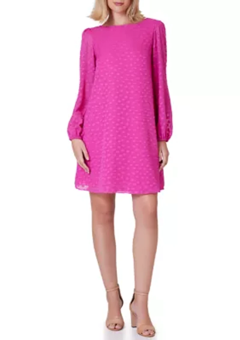 Allover clip-dotting texturizes the billowy chiffon structured of this blouson sleeve shift dress from Jessica Howard. Zip closure Boat neck Long blouson sleeves Lined Imported Product Specifications 37" L Material & Care Polyester Hand wash