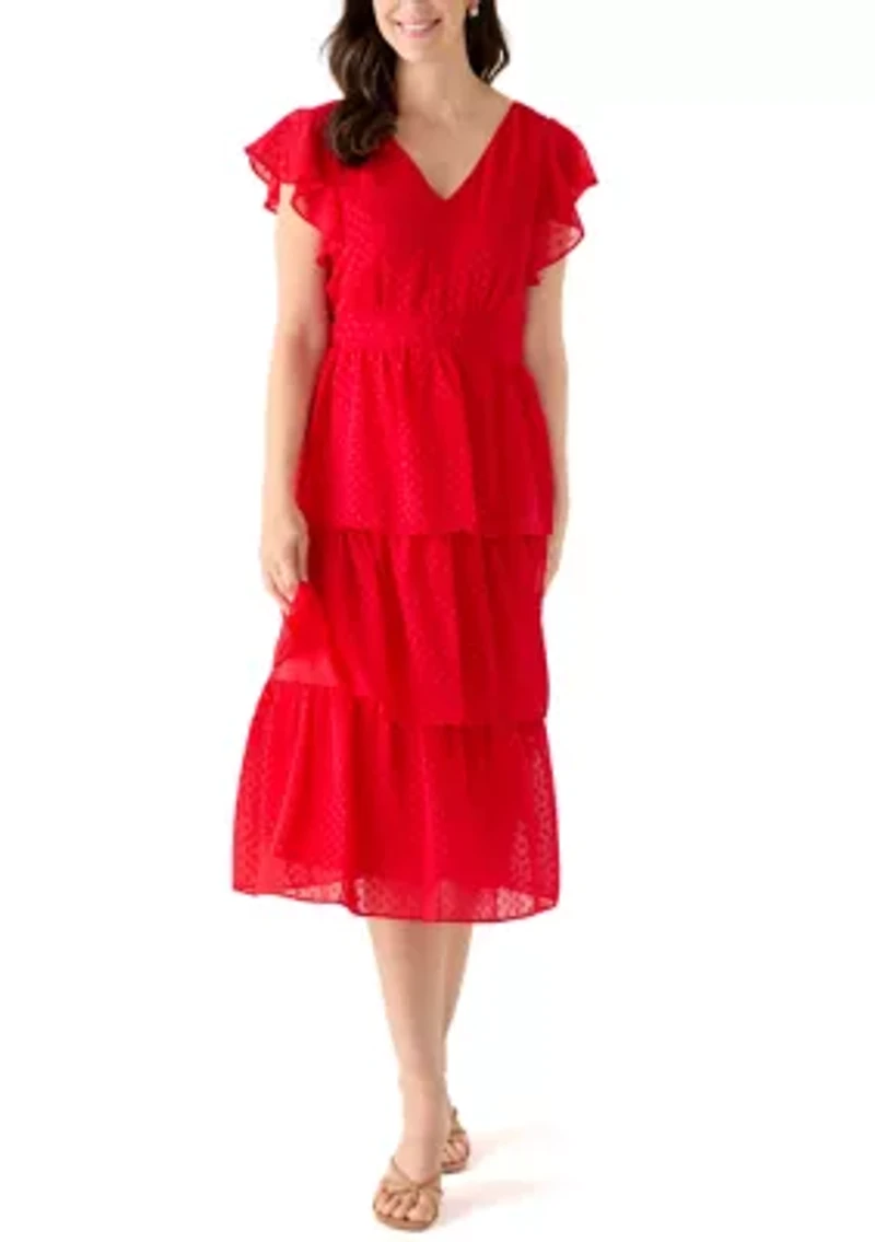 This lovely Robbie Bee dress, with its charming sheath style and beautiful tiers, offers a chic look that's perfect for all-day wear. Pullover V-neck Short flutter sleeves Imported Product Specifications 44" L Material & Care Polyester Machine washable