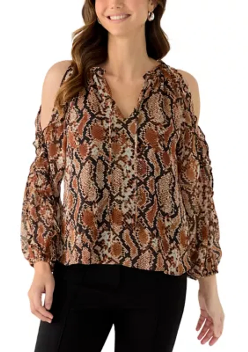 This Vince Camuto top is perfect for any occasion, featuring charming ruffles and a stylish cold shoulder design for a chic look all day long. Pullover Tie neck Long cold shoulder sleeves Fully lined Imported Product Specifications 22.5" L Material & Care 100% polyester Machine washable