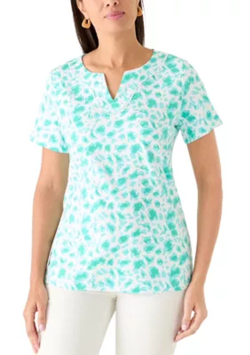 Women's Crochet Trim Split Neck Printed T-Shirt in Chattanooga, TN