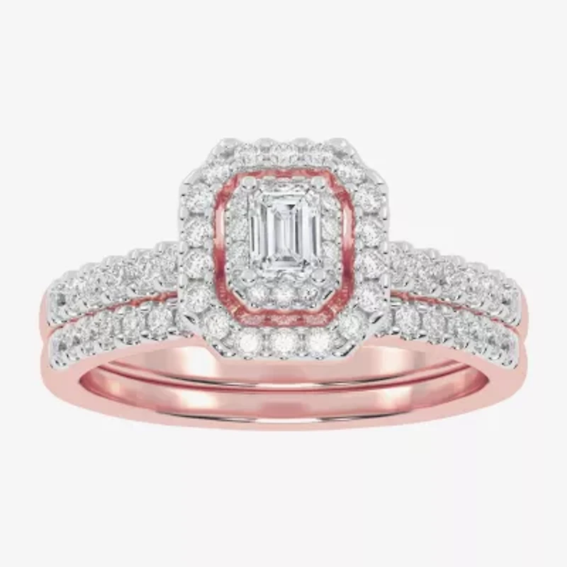 Womens CT. T.W. Natural White Diamond 10K Gold Cushion Side Stone Halo Bridal Set
