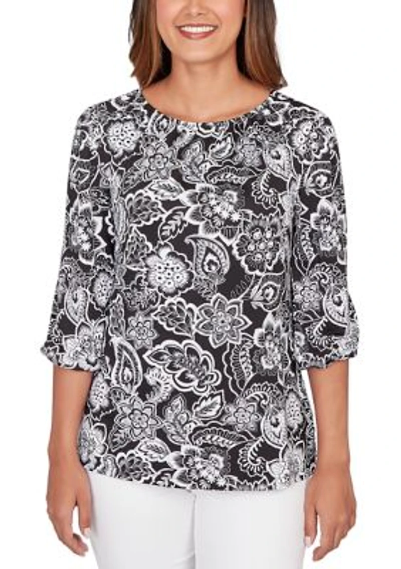 Bold blooms and dotted texture give this knit top from Ruby Rd standout charm. Featuring a crew neckline, puff print detailing and 3/4 elastic cuff sleeves, it adds a playful twist to one's everyday favorites. Pullover Boat neck 3/4 cap sleeves Unlined Imported Product Specifications 25.5" L Material & Care Polyester, spandex Hand wash