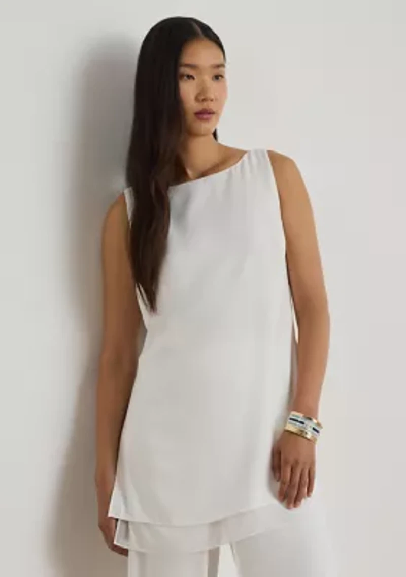 This sleeveless boatneck tunic from Lauren Ralph Lauren pairs double-faced georgette with a layered silhouette and side-split hem for a fluid drape. Relaxed fit Intended to hit at the mid-thigh US size 8 has a 29.5" body length Body length is taken from the center back of the neck Boatneck Concealed snapped closure at the interior right strap Sleeveless silhouette Side-split hem Bust darts Chiffon underlayer Shell and underlayer: 100% recycled polyester Machine wash cold, gentle cycle, only non-chlorine bleach when needed, hang to dry, cool iron if needed, dry clean Imported Model is 5'10" (178 cm) and wears a US size 4